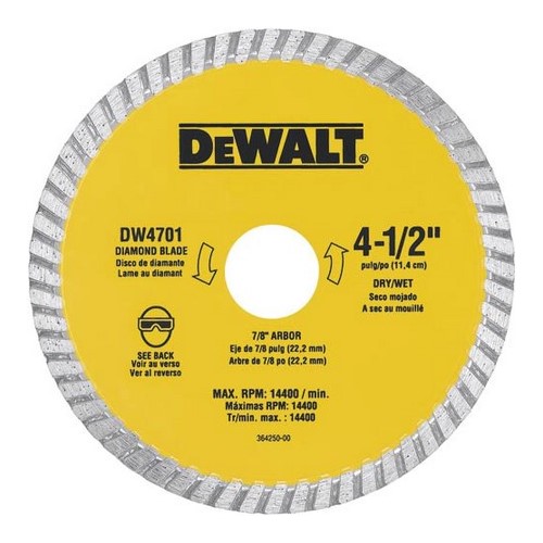 - Applicable Materials:Block, Brick, Masonry and TileArbor/Shank Size:5/8 in, 7/8 inBlade Diameter:4-1/2 inCutting Condition:DryCutting Depth:1-1/4 inMaximum Speed:13300 rpmSegment Height:7.5 mmType:Extended Performance Turbo Rim
