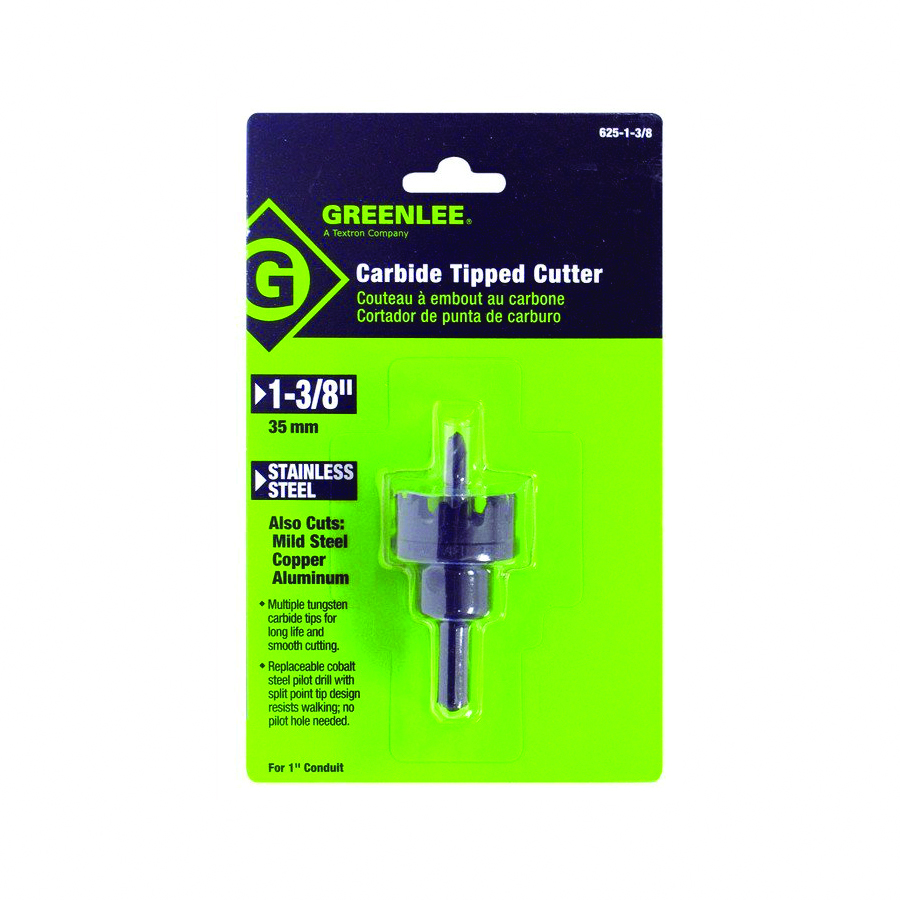 Greenlee® Hole Cutter, Series: 625, 1-3/8 in Diameter, 8 ga Cutting Depth, 1/4 x 1-7/8 in Drill, Tungsten Carbide Tip Cutting Edge, Teeth Cutting Edge, 250 rpm Speed, 3/8 in Chuck, 1/2 in Shank, Applicable Materials: Aluminum, Copper, Brass, Fiberglass, Mild Steel, Plastics and Stainless Steel