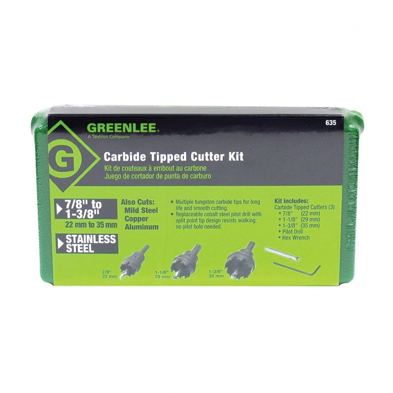 Greenlee® Hole Cutter Kit, 5 Piece, 3/16 in Cutting Depth, 3/8 in Hex Shank, 1/8 in Dia x 5/32 in L Pilot Drill, Carbide Tip