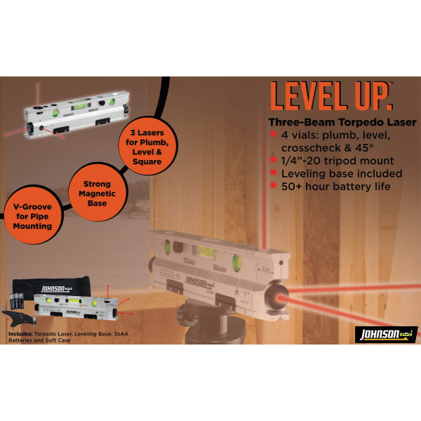 Johnson 40-6184 Magnetic Torpedo Laser Level, 9-1/2 in L, (2) Level/(3) Plumb Vial Position