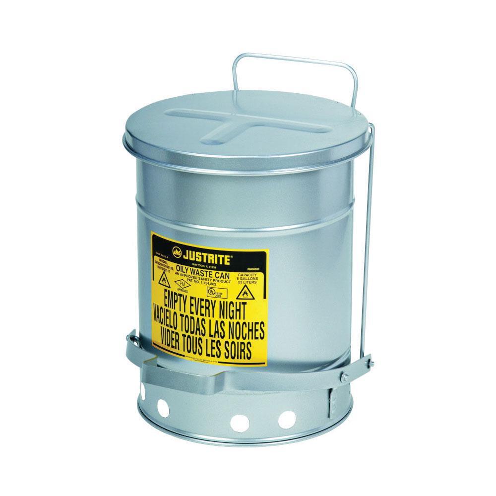 Justrite® Oily Waste Can, Foot Operated, 10 gal Capacity, 13.938 in Diameter, 18-1/4 in Height, Steel, Powder Coated, Silver