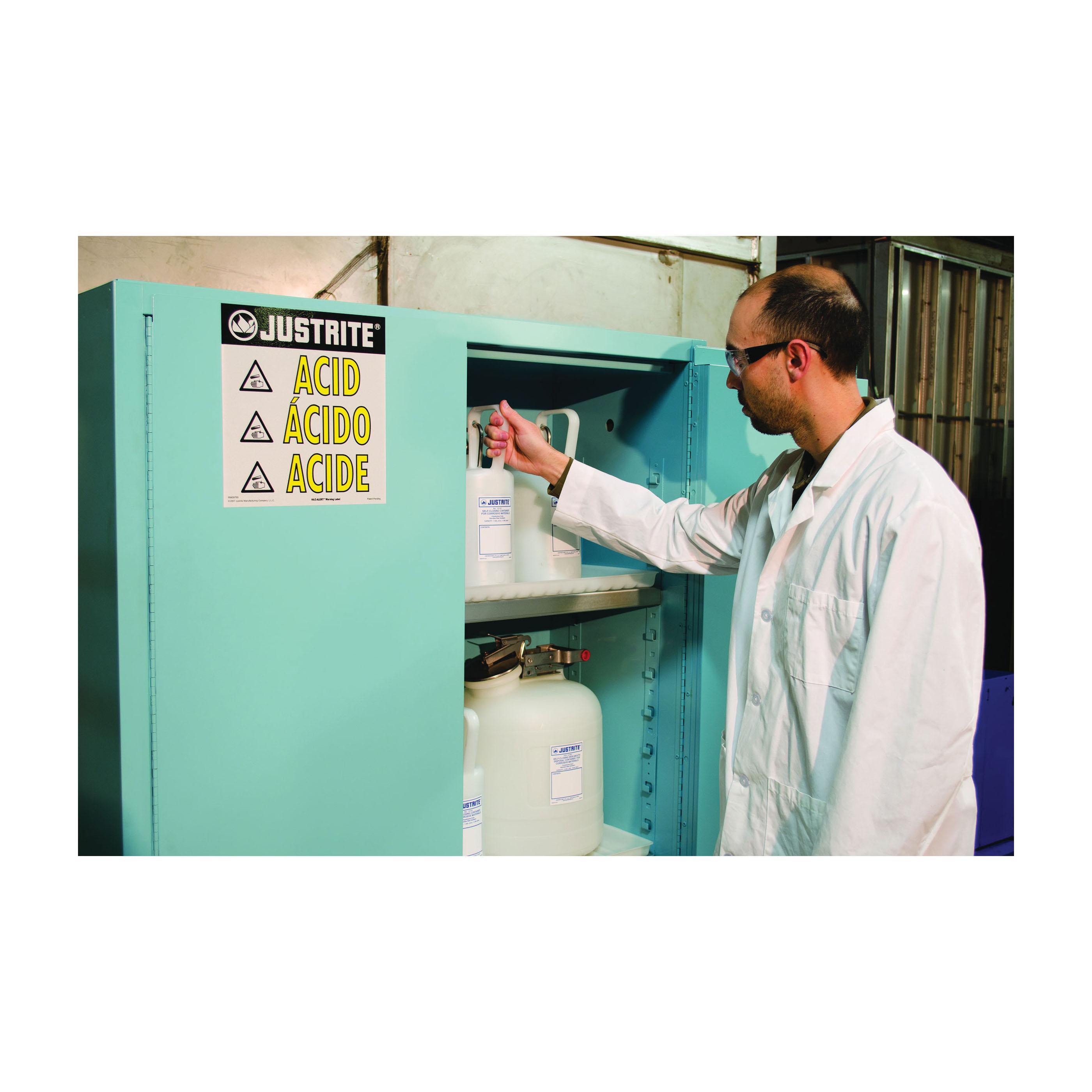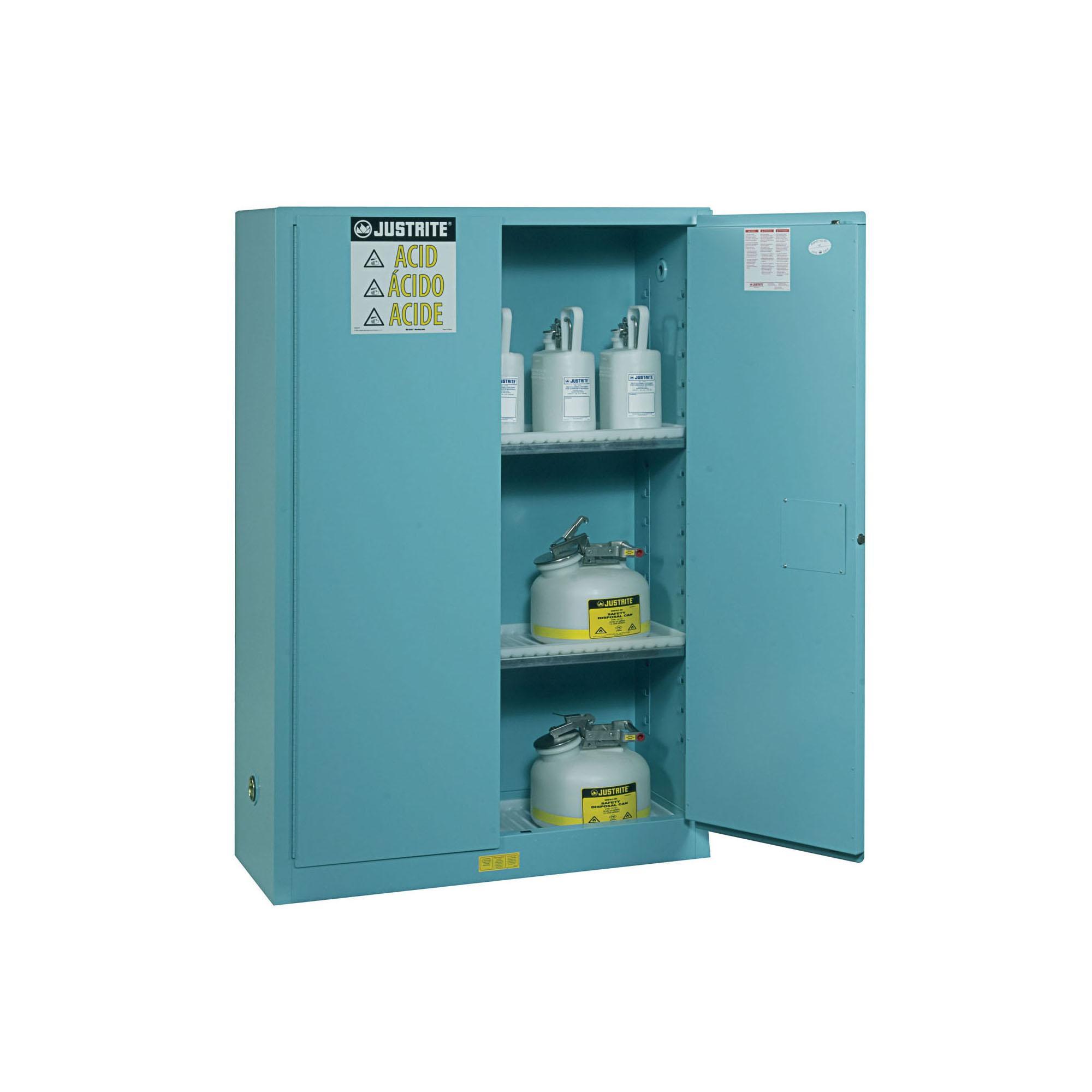 Justrite 894502 Sure-Grip EX Classic Corrosive Safety Cabinet, 45 gal Capacity, 65 in H x 43 in W x 18 in D, Manual Close Door, 2 Doors, 2 Shelves, 18 ga Cold Rolled Steel, Blue