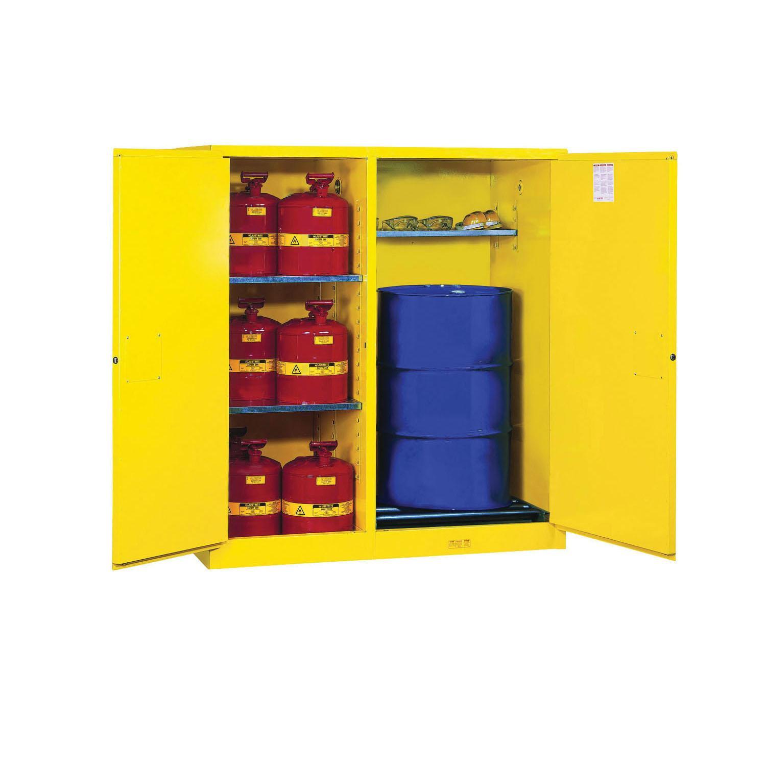 Justrite 899260 Sure-Grip EX Double Duty Safety Cabinet, 115 gal Capacity, 65 in H x 59 in W x 34 in D, Manual Close Door, 2 Doors, 3 Shelves, Cold Rolled Steel, Yellow