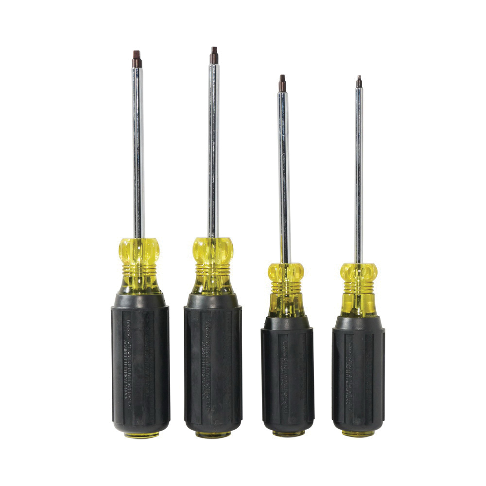- Color:BlackESD-Safe:NoFinish:Polished ChromeHandle Type:Cushion GripInsulated:NoMaterial:Steel/Acetate, Steel/Acetate With Vinyl Grip HandleMeasurement System:ImperialNumber of Pieces:4Screwdriver Types Included:Square Recessed, YesSpecifications:4 in L Round ShankSpecifications Met:ASME Specified