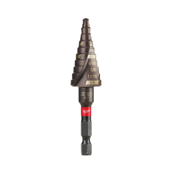 - In Stock:YesApplicable Materials:Iron, Steel, Aluminum, Brass, Copper and WoodCutting Depth:2.044 inFinish:TiAlN CoatedFlute Length:2.044 inFlute Type:Dual SpiralMaterial:TitaniumMaximum Hole Diameter:1/2 inMinimum Hole Diameter:3/16 inNumber of Flutes:2Number of Hole Sizes:6Number of Steps:6Overall Length:3-43/64 inPoint Type:Rapid Strike TipShank Size:1/4 inShank Type:HexType:Impact
