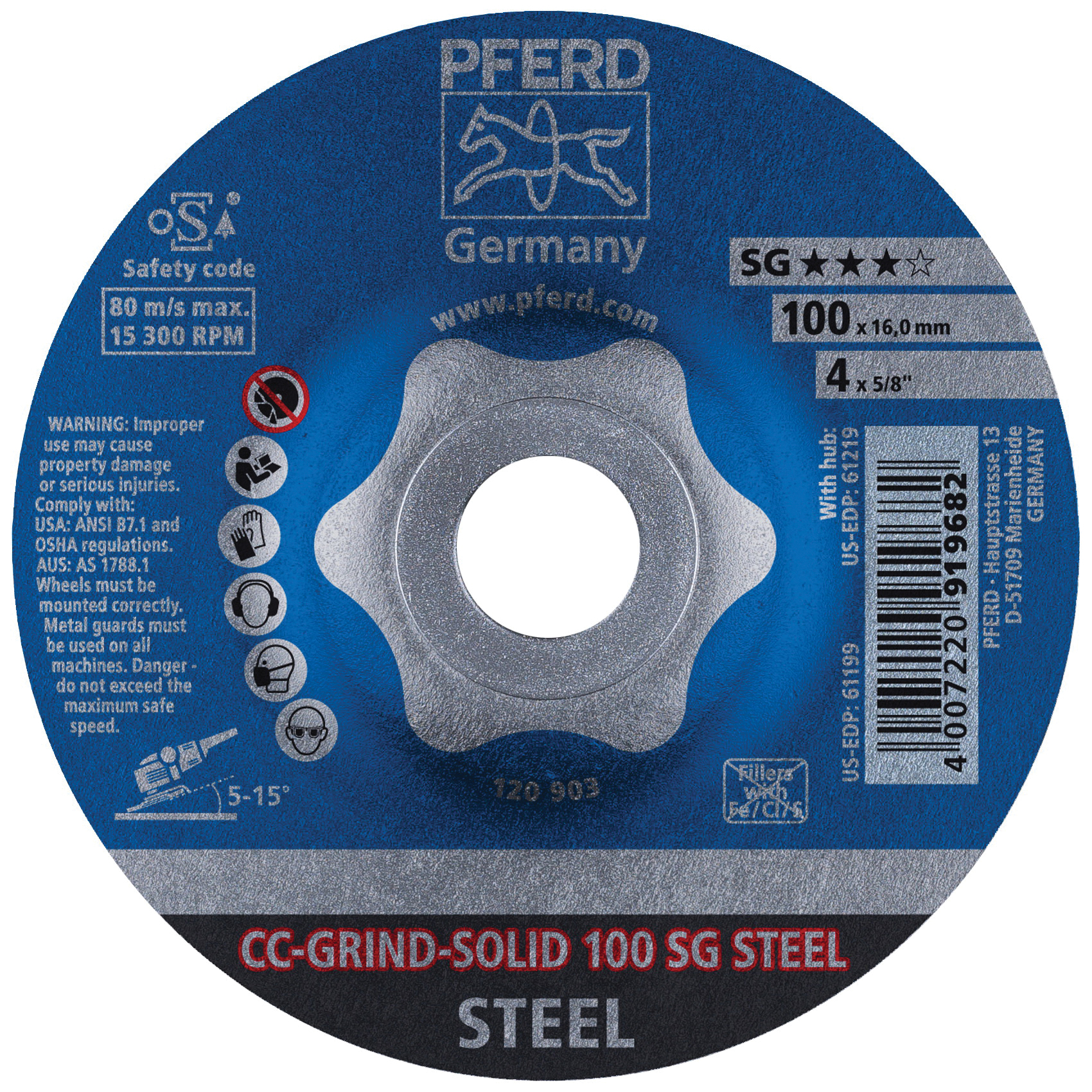 PFERD CC-GRIND®-SOLID Performance Line SG Coated Abrasive Disc, Unthreaded, 5 in Diameter Disc, 12200 rpm Maximum