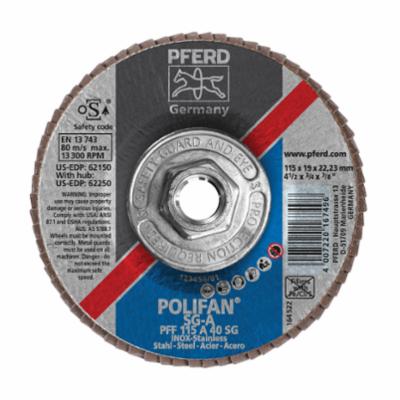 PFERD Polifan® Coated Abrasive Flap Disc, Threaded, Series: Performance Line SG A, 4-1/2 in Disc Dia, 5/8-11 Center Hole Thread Size, 120 Grit, Aluminum Oxide Abrasive, Type 27 Flat Disc, Cloth Backing, 13300 rpm Maximum