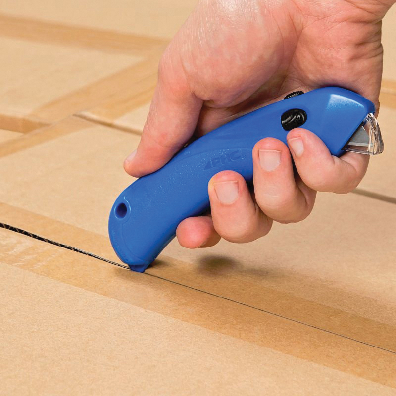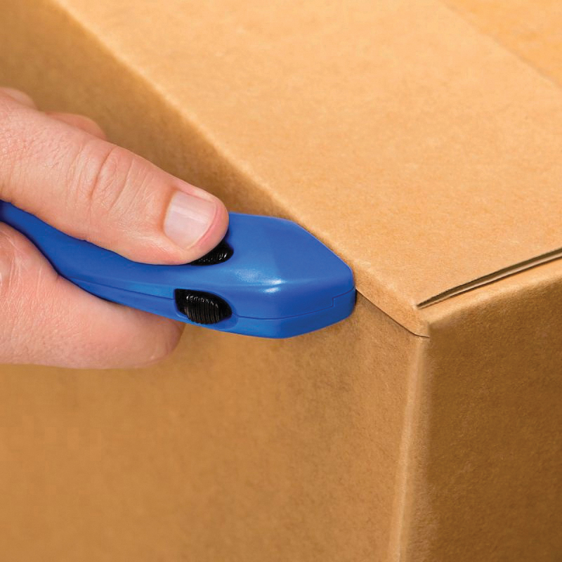Quick Blade Restaurant Safety Cutter, 3-Button Spring Back, Fixed Blade, Stainless Steel Blade, Blades Included: 1, 5/8 in Thickness, Ergonomic Handle, Plastic Handle, 1 Points, 5-5/8 in Overall Length, 1-1/2 in Overall Width