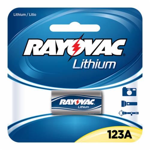 Rayovac®, RL123A-1, Photo Lithium Battery, Lithium Manganese Dioxide (Li/MnO2) Chemical System, 3 VDC Nominal, 1400 mAh Nominal, 123A Battery, 2 VDC Discharge Cut-Off, 100 Ohm Internal, Cap/Recessed Base Terminal, Plastic Case, 10 years Shelf Life, 0.669 in L x 0.669 in W x 1.358 in H Dimensions