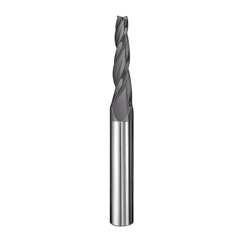 SGS® End Mill, Fractional Square End Tapered, Series: 23S, 1/8 in Diameter Cutter, 3 in Overall Length, 1/2 in Length of Cut, 3 Flutes, Spiral Flute, 1/4 in Shank Diameter, Right Hand Cutting Direction, 28 deg Helix Angle, Straight Shank, 2-1/2 in Shank Length, Micrograin Solid Carbide, TA Coated