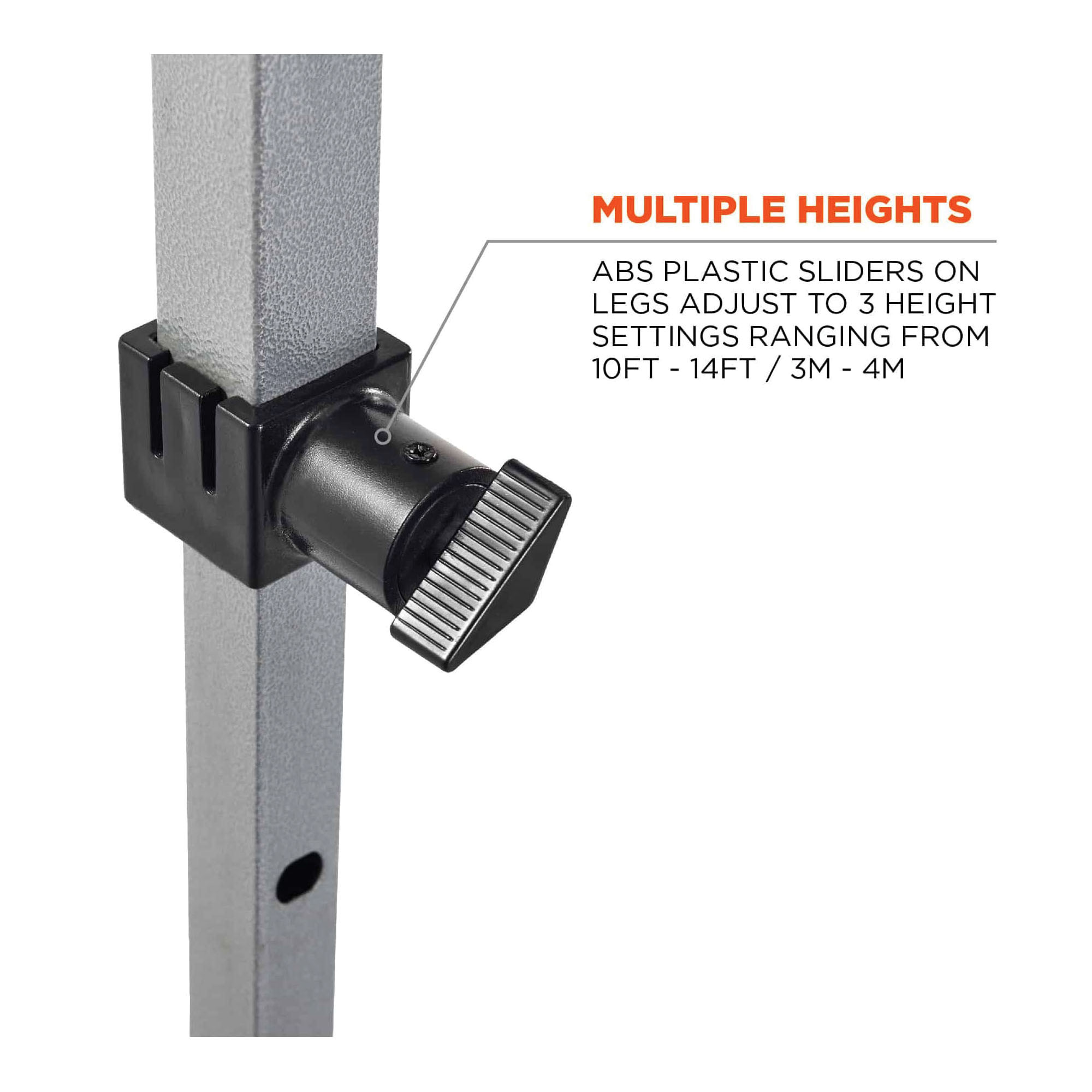 • Multiple heights - ABS plastic sliders on legs adjust to 3-height settings ranging from 10 to 14 ft/3 to 4 m