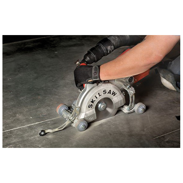 - Integrated rolling foot plate with rubber wheels allows saw to move smoothly across concrete surfaces