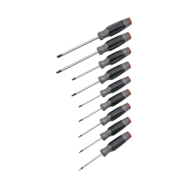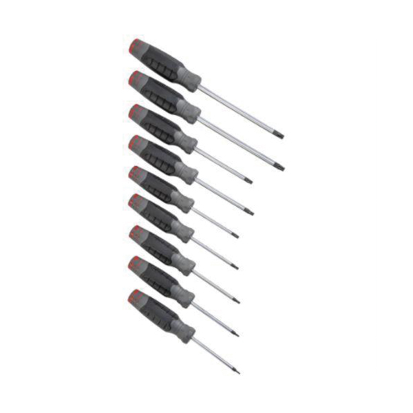 - ESD-Safe:NoFinish:Polished Chrome/Black Oxide TippedHandle Type:Ergonomic Quad-Lobe, Ergonomic/Quad-LobeInsulated:NoMaterial:Alloy Steel ShankMeasurement System:ImperialNumber of Pieces:9Screwdriver Types Included:Torx, Torx®Specifications:3 to 6 in L Round ShankSpecifications Met:ASME B107.15