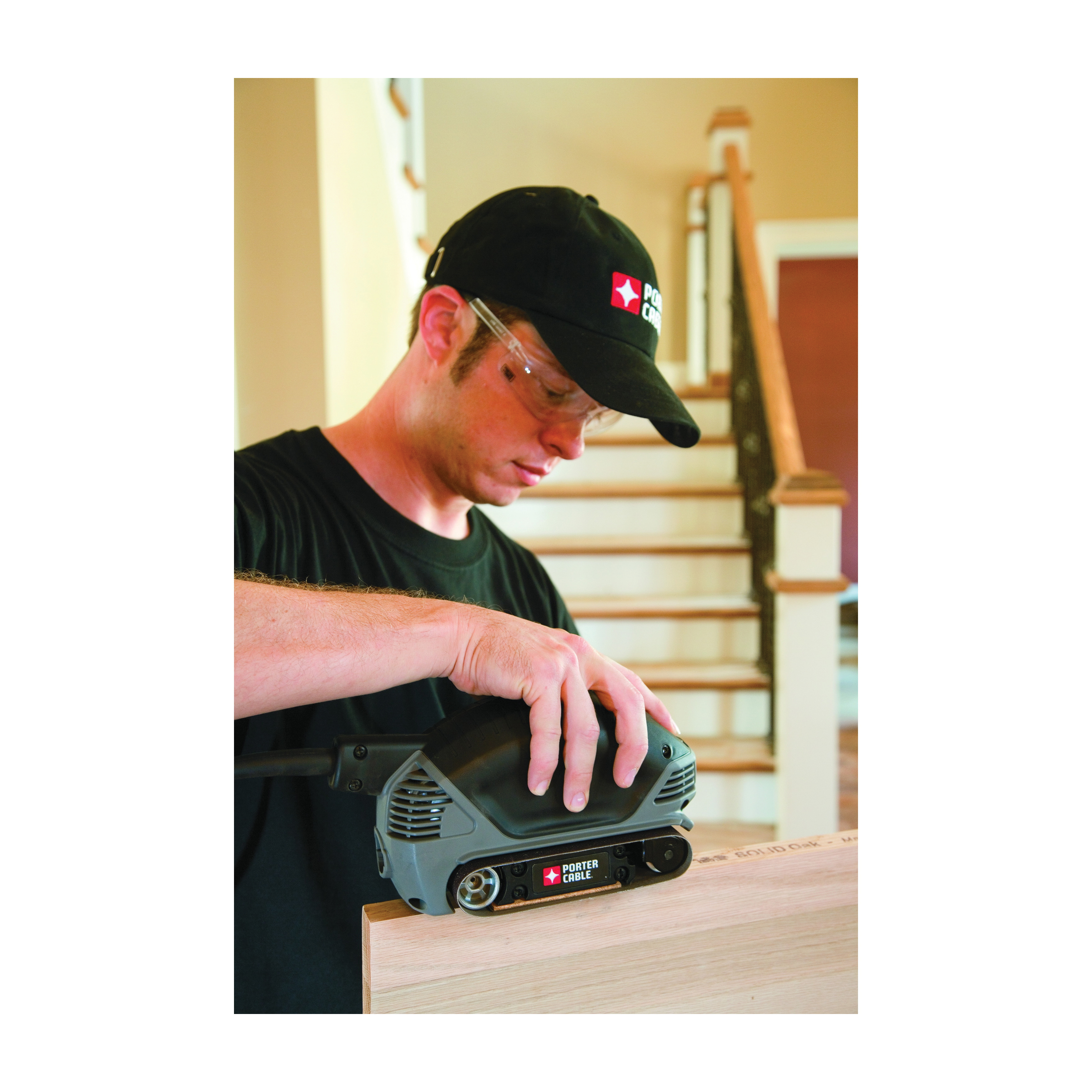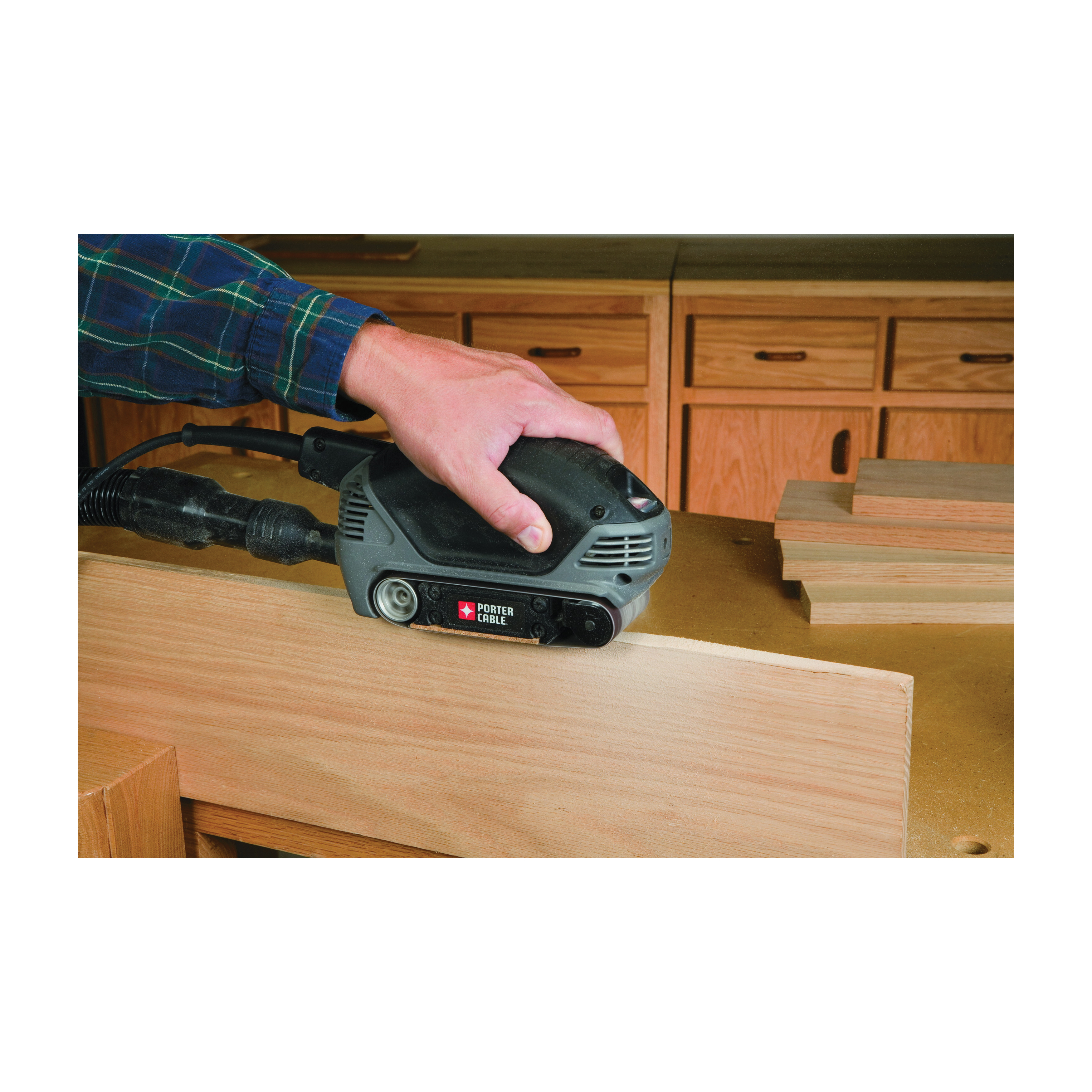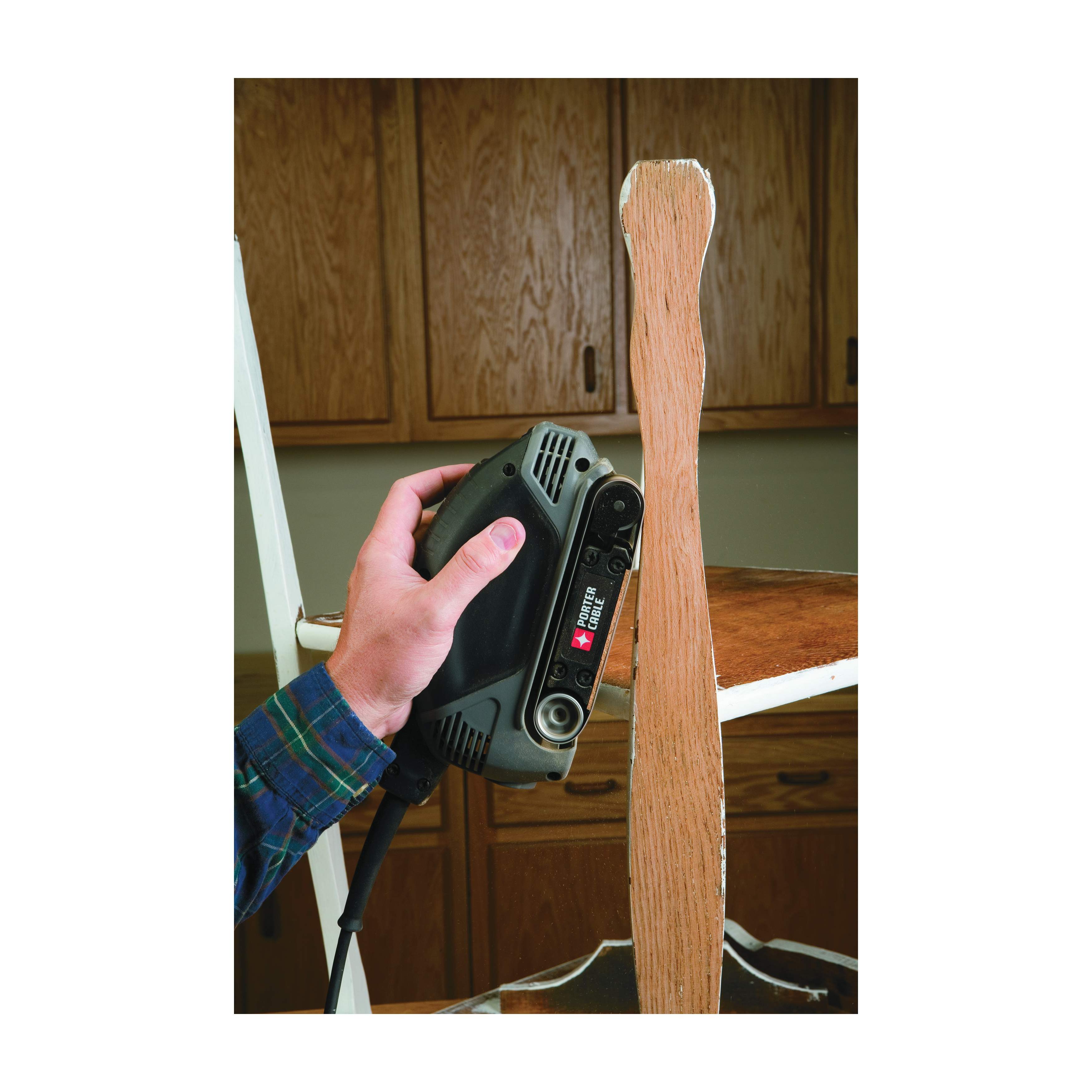 Porter-Cable® Electric Belt Sander, Compact, 17 in Belt Length, 4-1/2 in Belt Width, 1100 rpm Speed, 120 VAC, 5 A, Metal Housing Material, Auxiliary/Removable Handle, Black/Gray, On/Off Switch Control, 5-1/2 in H Dimensions