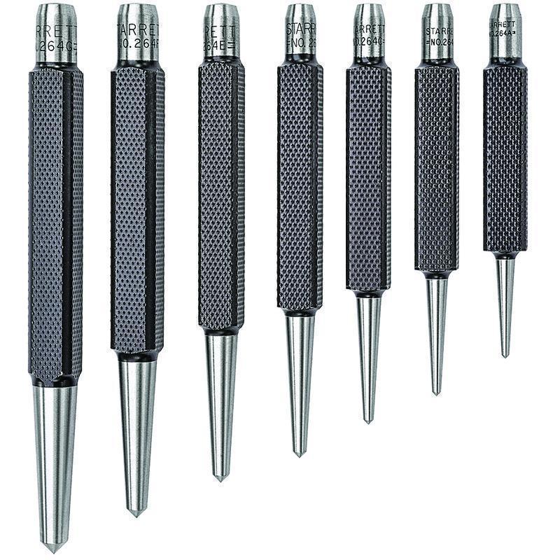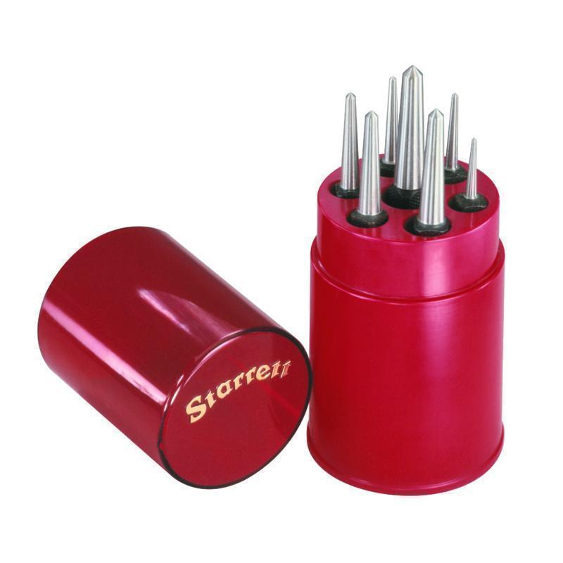Starrett® Punch Set, 1/16 to 1/4 in Punch, 5 in Overall Length, 7 Punches, 7 Piece, Center Style, Square Shank, 1/16 in, 5/64 in, 3/32 in, 1/8 in, 5/32 in, 3/16 in, 1/4 in Punches and Round Red Plastic Box Set Contents, Steel