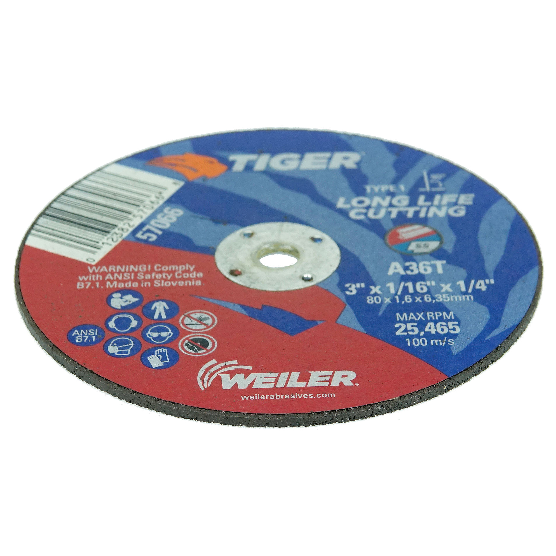 Tiger 57066 Flat Long Life Performance Cut Cutting Wheel, 3 in Dia x 1/16 in THK, 1/4 in Center Hole, 36 Grit, Aluminum Oxide Abrasive
