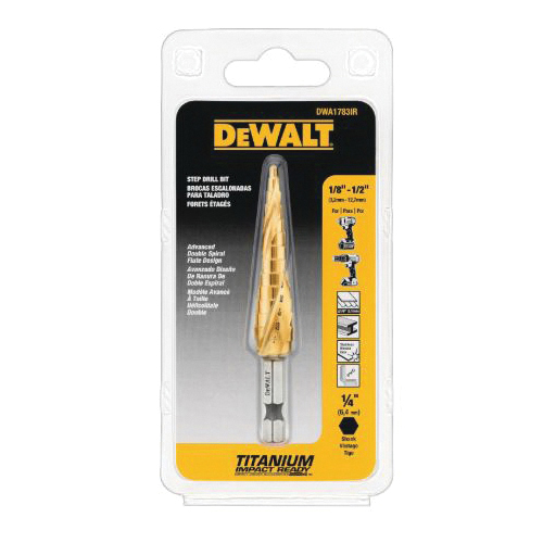 DeWALT IMPACT READY DWA1783IR High Performance Impact-Rated Step Drill Bit, Imperial, 1/8 in Dia Min Hole, 1/2 in Dia Max Hole, 13 Steps, Titanium, 13 Hole Sizes, 1/4 in Shank