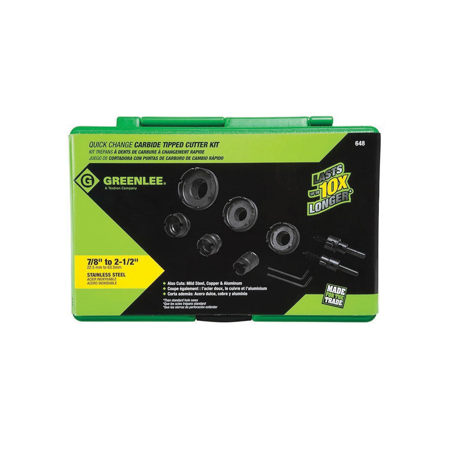 Greenlee® Hole Cutter Kit, Quick-Change, 7/8 in Minimum Cutter Diameter, 2-1/2 in Maximum Cutter Diameter, 8 Piece, Specifications: Carbide Tip, For Use With: 1/2 to 2 in Conduit, Tungsten Carbide, Oxide Coated