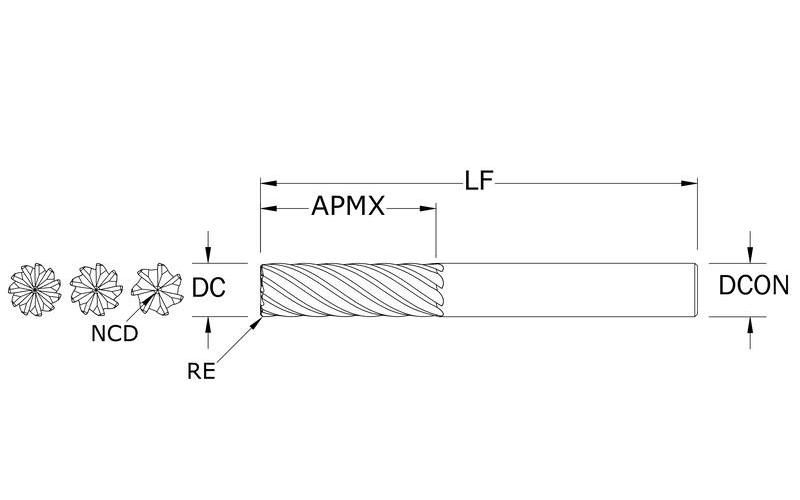 SGS 36627 66C Corner Radius Fractional High Performance Long Length Multi-Flute High Performance End Mill, 3/16 in Dia Cutter, 5/8 in Length of Cut, 7 Flutes, 3/16 in Dia Shank, 2 in OAL, TA Coated