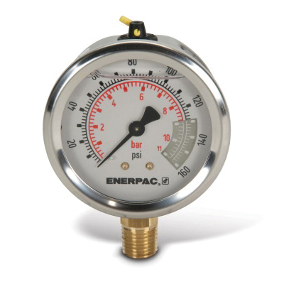 Enerpac G2515L Glycerin Filled Lower Mount Hydraulic Pressure Gauge, 2000 psi, 2-1/2 in Dia Gauge, 1/4 in NPTF Connection, +/-1.5 % Accuracy, Copper Alloy