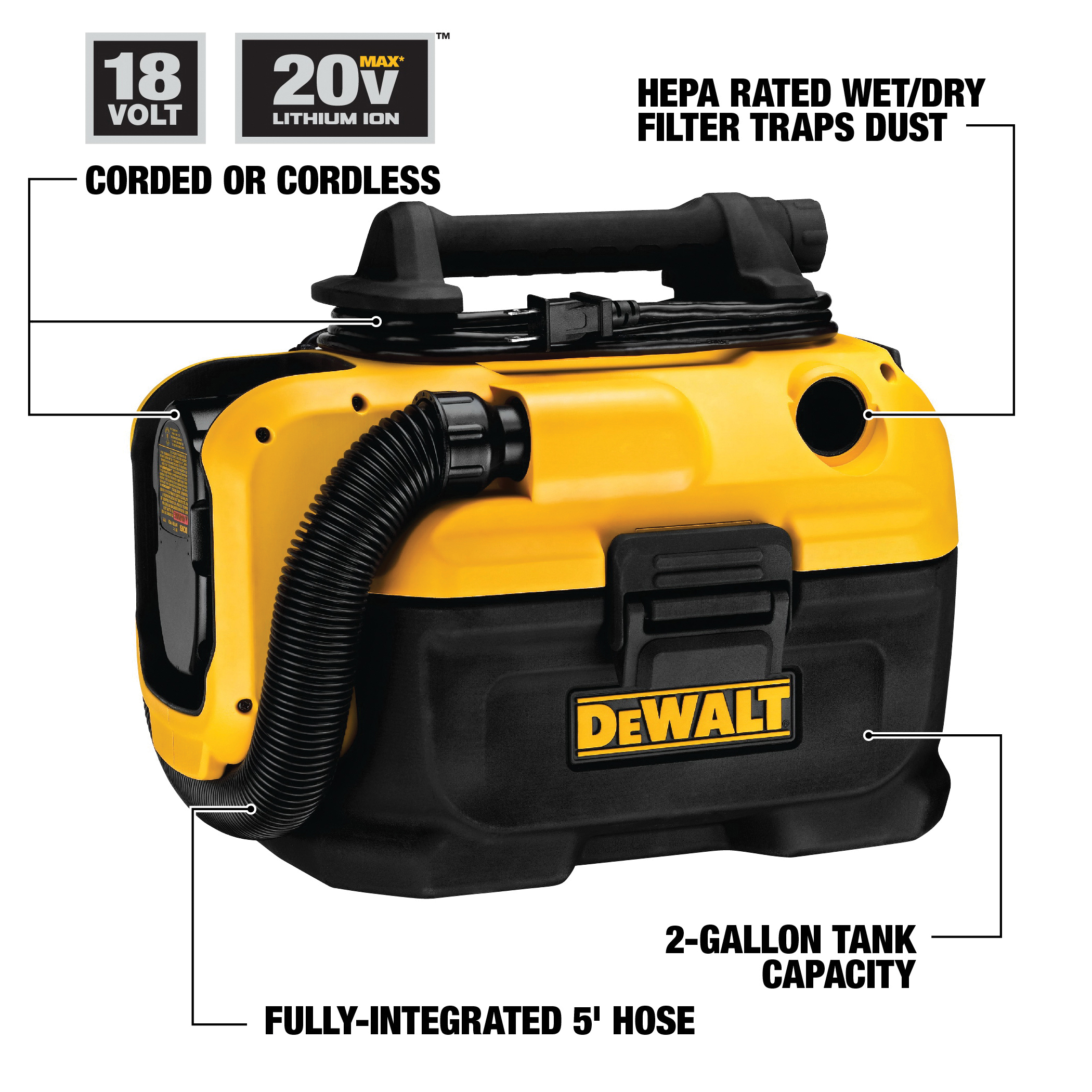 DeWALT DCV581H Industrial Wet/Dry Vacuum, 8 A, 2 gal Tank, 18/20 V DC