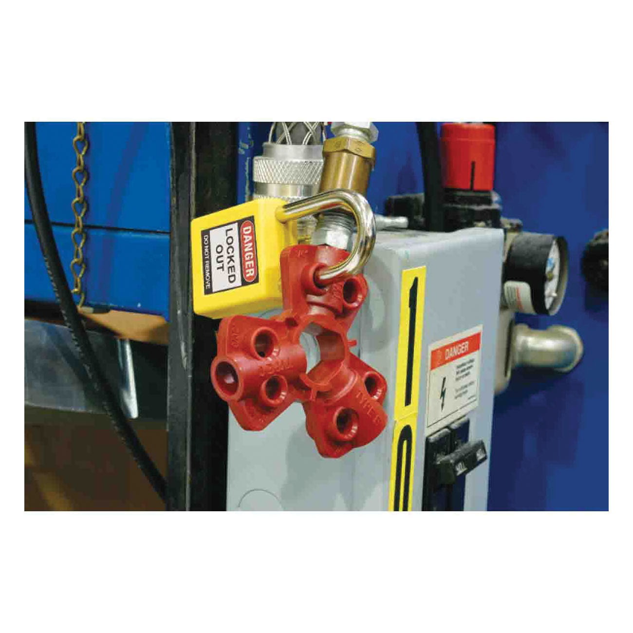 - Quick-disconnect lockout is applied to the male fitting, isolating equipment from all compressed air sources